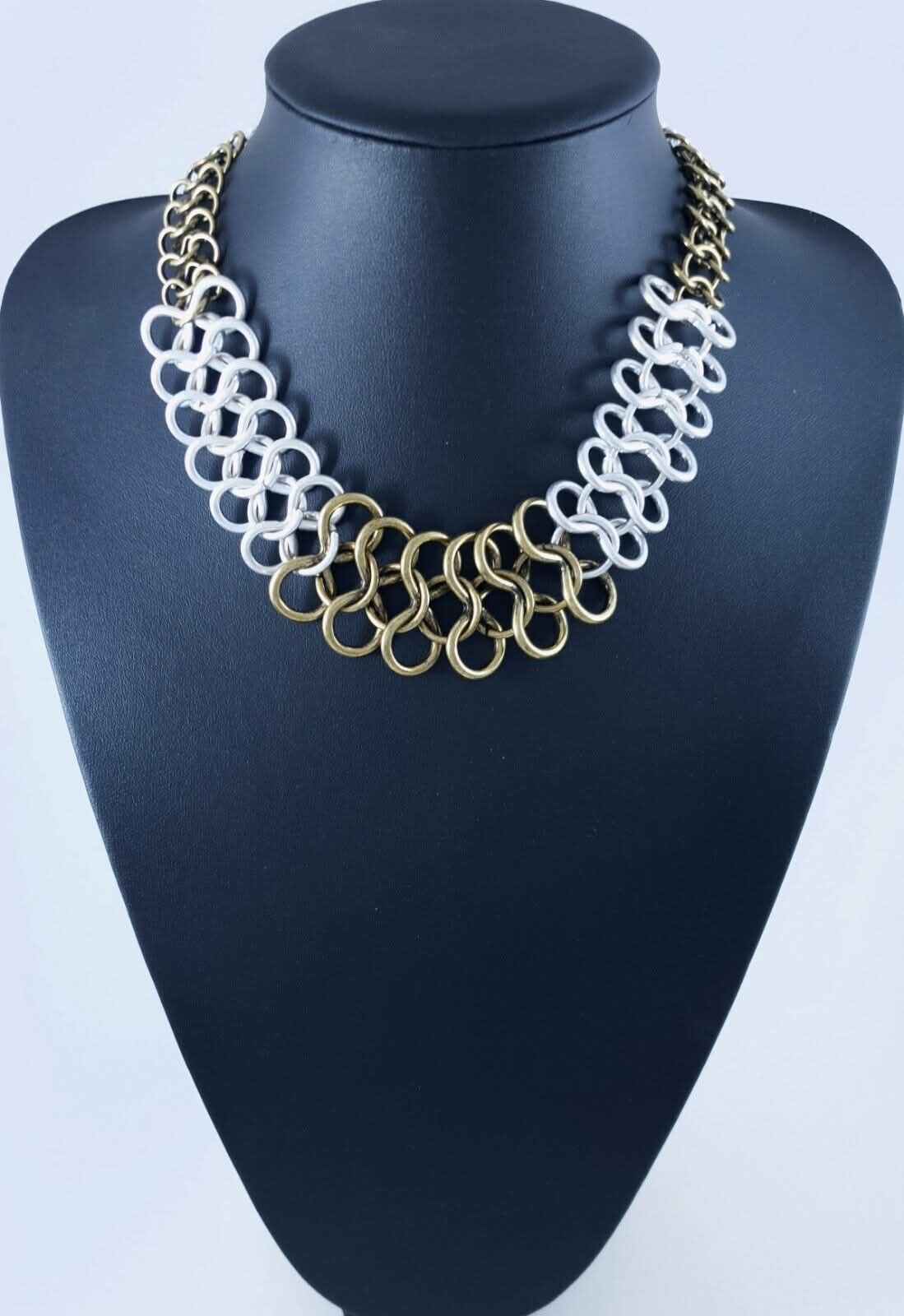 This is a eye catching necklace made from matt silver and brass colour metal chainmail design statement necklace.